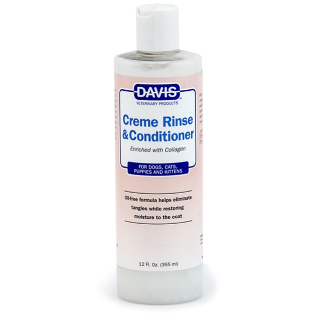 Davis Crème Rinse & Conditioner is specifically formulated with enriched collagen to create a protective coating on each cuticle of your pet’s hair while restoring essential amino acids and moisture to the skin. This rich formula adds body and sheen, leaving the coat looking healthy, radiant, and tangle-free. Regular use soothes dry coats and simplifies combing, brushing, and overall manageability.
